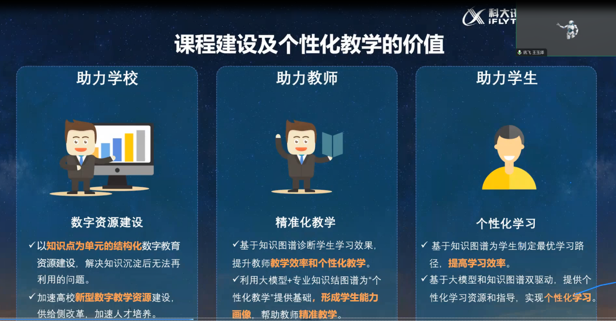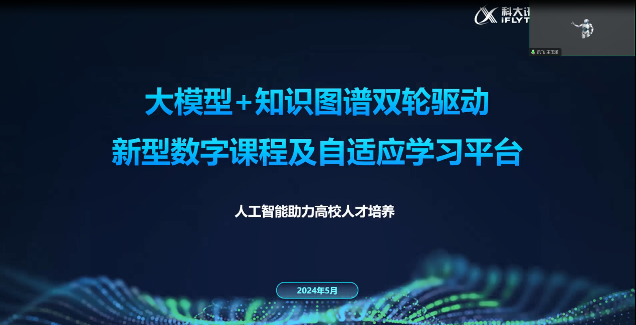 为深化教师对数字时代认识,借助现代科技力量推动课程与教学改革,202451514:30,科大讯飞北方方案咨询负责人、人工智能技术高级工程师、高教研究院研究员王玉泽,为yl8858永利集团教师讲授了一场题为《大模型+知识图谱双轮驱动新型数字课程及自适应学习平台——人工智能助力高校人才培养》的线上讲座。
