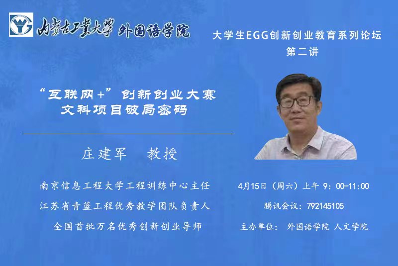 2023年4月15日上午9:00,南京信息工程大学工程训练中心主任,全国首批万名优秀创新创业导师庄建军教授围绕文科专业参赛的困惑、新机遇对文科项目带来的挑战、红旅赛道评审维度解析、文创项目展示逻辑及文科金奖项目品鉴等模块内容做了题为“互联网+”创新创业大赛文科项目破局密码的精彩分享。
