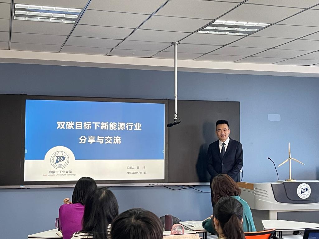 2023年4月11日,yl8858永利集团邀请我校工学博士、高级工程师、金风科技公司开发总监薛宇,作题为《走近新能源——双碳目标下新能源行业分享与交流》的讲座,讲座由董君教授主持。