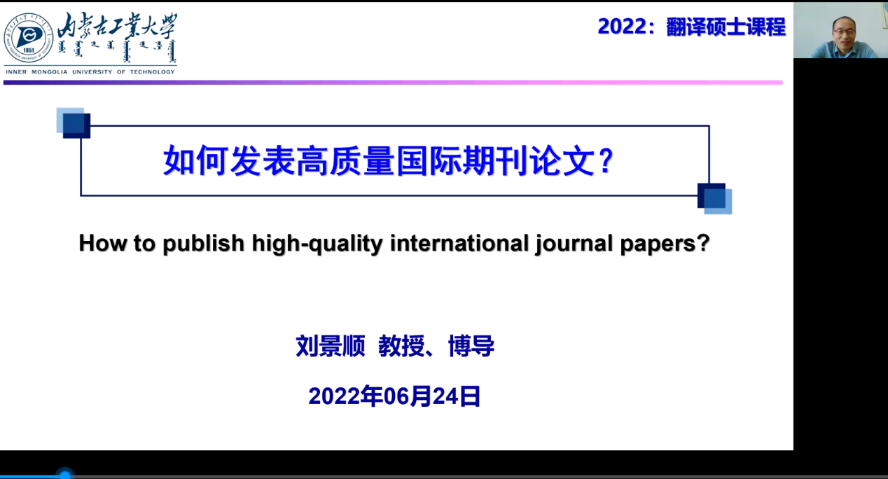 6月24日晚19:00,yl8858永利集团邀请我校材料学院副院长、博士生导师刘景顺教授通过腾讯会议作题为“如何发表高质量国际期刊论文”的线上学术讲座,2020级、2021级全体研究生以及部分专业教师、研究生导师百余人在线参加。此次讲座是对我院翻硕硕士研究生专业选修课《科技翻译工作坊》的课程补充和延续。