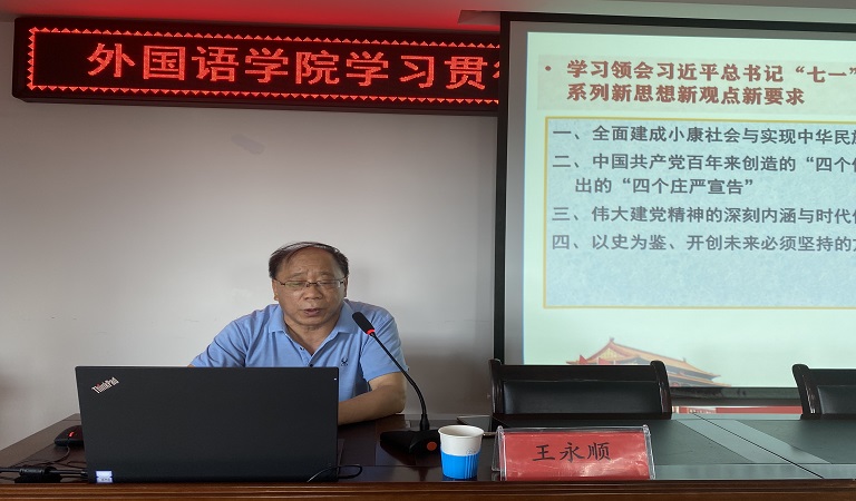 会上,王永顺教授结合自身学习体会,从全面建成小康社会与实现中华民族伟大复兴主题,中国共产党百年来创造的“四个伟大成就”和向世界做出的“四个庄严宣告”,伟大建党精神的深刻内涵与时代价值,以史为鉴、开创未来必须坚持的方针原则和根本要求等四个方面系统的阐释了习近平总书记“七一”重要讲话提出的一系列新思想新观点新要求,讲座内容丰富、生动鲜明、振奋人心,对我们学习贯彻总书记“七一”重要讲话精神具有重要的指导意义。