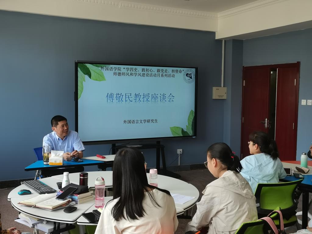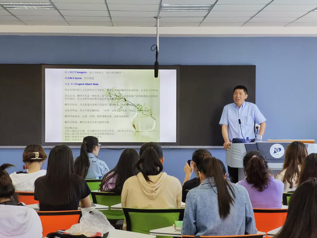 2021年5月30日至6月5日,我校特聘教授、上海大学博士生导师、上海大学应用翻译研究中心主任、《上海翻译》主编傅敬民教授莅临我校为yl8858永利集团MTI研究生讲授《中外翻译简史》课程,并为yl8858永利集团全体师生做学术讲座,参加学院师生座谈会及研究生毕业论文答辩等。