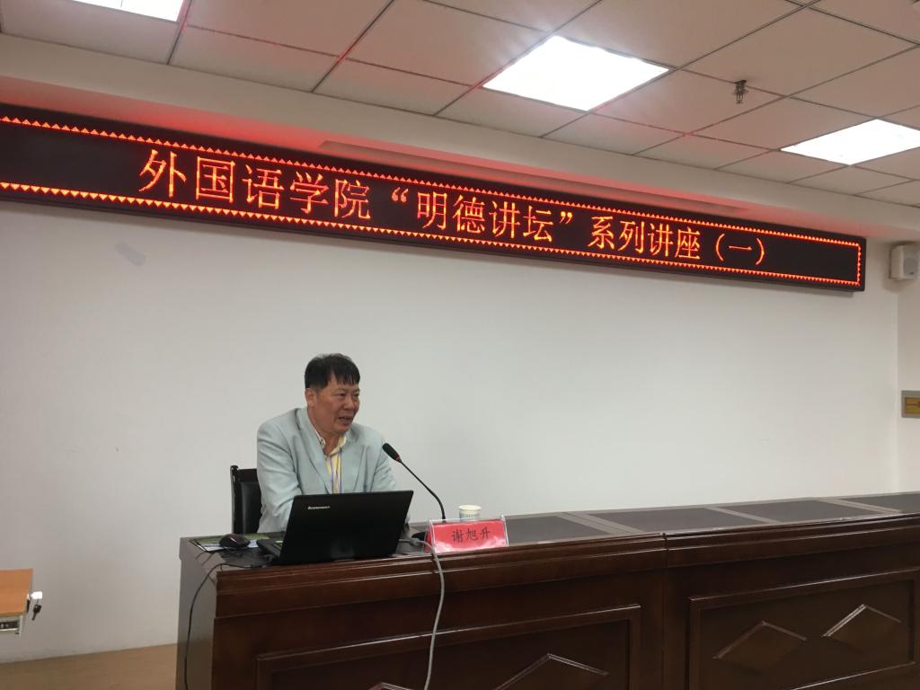4月29日,全国翻译专业学位研究生教育指导委员会委员、中国英汉语比较研究会理事、新疆大学谢旭升教授应邀做客yl8858永利集团明德论坛,为全院师生带来两场学术讲座,学院全体教师、研究生及部分本科生聆听了讲座。讲座由yl8858永利集团副院长栗霞主持。
