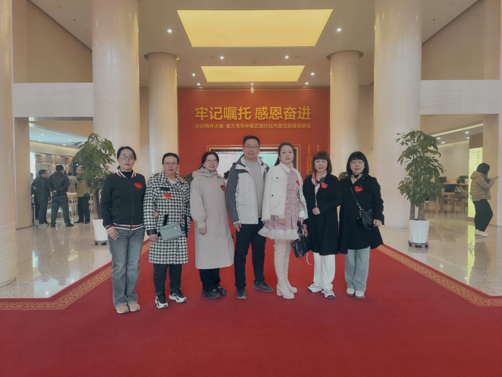 师生代表集体参观了“牢记嘱托 感恩奋进”“感党恩、听党话、跟党走”两个主题展览。展览以铸牢中华民族共同体意识为主线,紧紧围绕“感党恩、听党话、跟党走”主题,通过百余幅图片、图表、实物展品和一段段生动的文字,集中展现了内蒙古各族干部群众在革命、建设、改革各个历史时期在党的坚强领导下取得的突出成绩,以及新时代十年紧跟习近平总书记奋进新征程、建功新时代的生动实践。