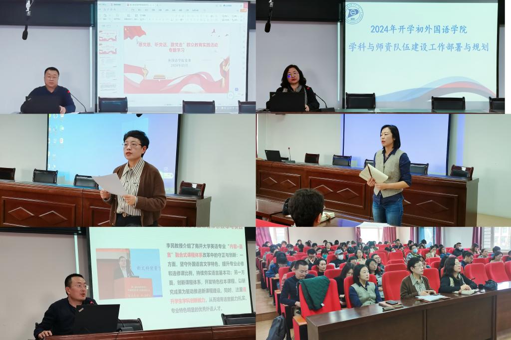 会上,董君院长对学院学科与师资队伍建设工作进行了部署与规划,解读第八届全国高等学校外语教育改革与高端发展论坛会议精神,分析外语学科的发展方向。外语系系主任田忠山、公共外语教学部主任孙磊进行汇报,分享专业建设及外语教学发展的前沿知识。王智音副院长针对学院教学问题的整改,教学制度的修订以及教学管理的加强作发言。张媛副院长鼓励学院教师积极参与到各级各类项目的申报当中,集合多方力量推进学院科研发展。