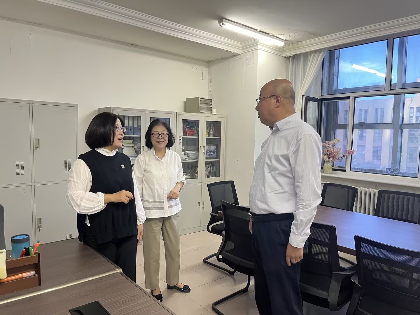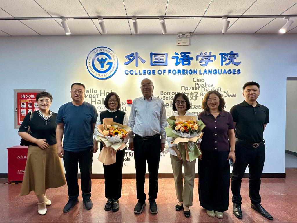 首先,王利明副校长来到外语教育创新研究基地,看望正在工作的深耕教坛三十几年的老教授,他代表学校向两位教师致以节日的问候,祝她们“教师节快乐!你们辛苦了!”并向老教授赠送了花束。