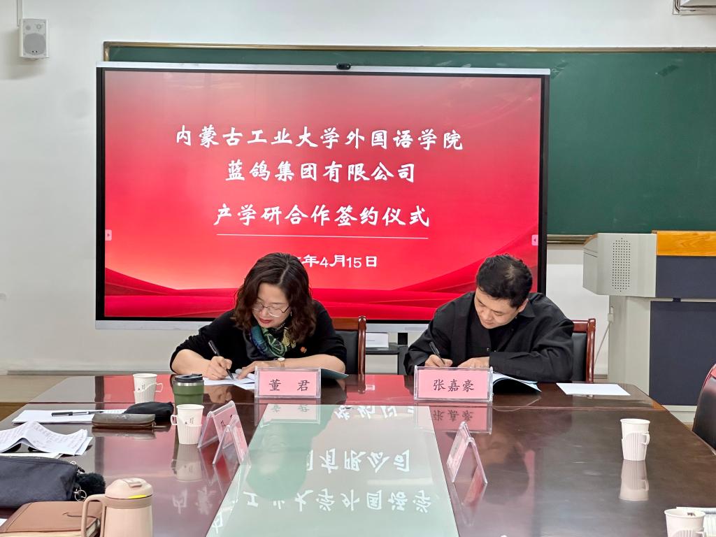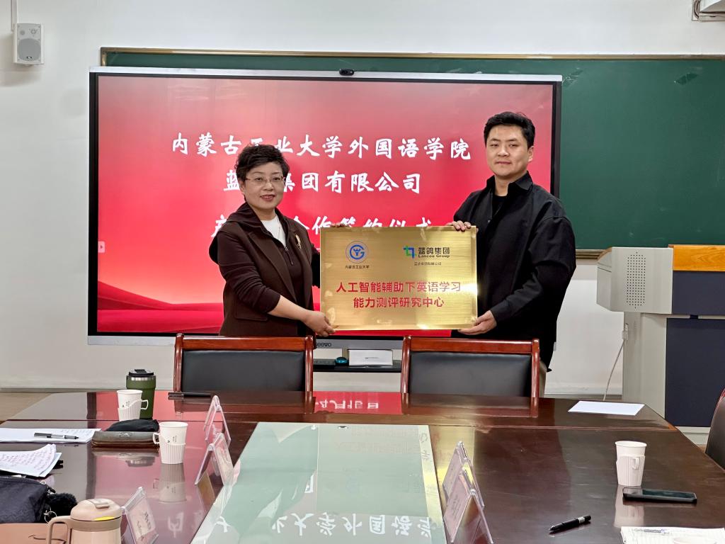 为深化产教融合,推动人工智能技术赋能外语教学,yl8858永利集团与蓝鸽集团有限公司于4月15日下午在电力大楼422室签署产学研合作协议,并举行“人工智能辅助下英语学习能力测评研究中心”揭牌仪式。yl8858永利集团院长董君、教学副院长王智音、蓝鸽集团内蒙古办事处负责人张嘉豪一行三人及学院相关教师出席签约仪式。
