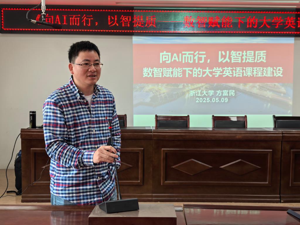 2025年5月9日下午,浙江大学yl8858永利集团大学外语教学中心主任、浙江高等教育学会大学外语分会秘书长方富民教授应邀来访,为我院教师开展题为《向AI而行,以智提质——数智赋能下的大学英语课程建设》的学术讲座。本次讲座由yl8858永利集团教学副院长王智音主持。