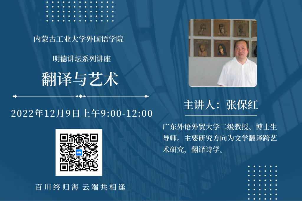 广东外语外贸大学张保红教授,分别于12月5日和12月9日通过腾讯会议为我院师生开展“经典学习与翻译实践”和“翻译与艺术”学术讲座,欢迎踊跃参加。
