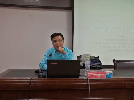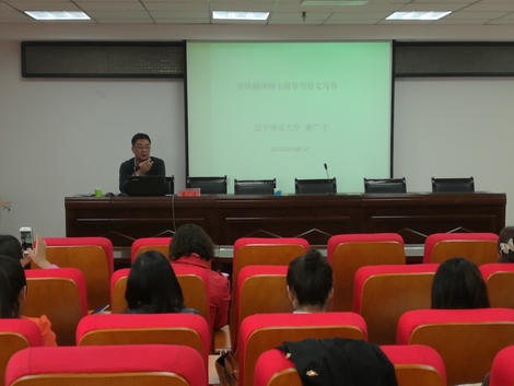 此次报告会邀请首都师范大学贾洪伟博士和辽宁师范大学董广才教授主讲。贾洪伟博士介绍了语言田野调查法的历史,并对中国传统语言研究田野调查与现代语言田野调查进行了比较,强调了该调查法在语言学上的重要性。第二场报告会,董广才教授通过翻译硕士的培养方式、专业实习、考核方式等各个环节,就如何培养高层次、应用型和专业型口笔译人才进行了深入浅出的讲解,并对课程设置提出积极的建议;此外,他还强调了英语翻译硕士学位论文的撰写规范,并提出了指导性意见。