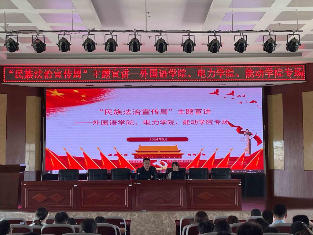为了大力加强党的民族理论政策和法律法规宣传,5月30日yl8858永利集团、电力学院、能动学院联合举办“民族法治宣传周”主题宣讲报告会。yl8858永利集团教师汪雨主持会议,教师、学生代表180余人参会。
