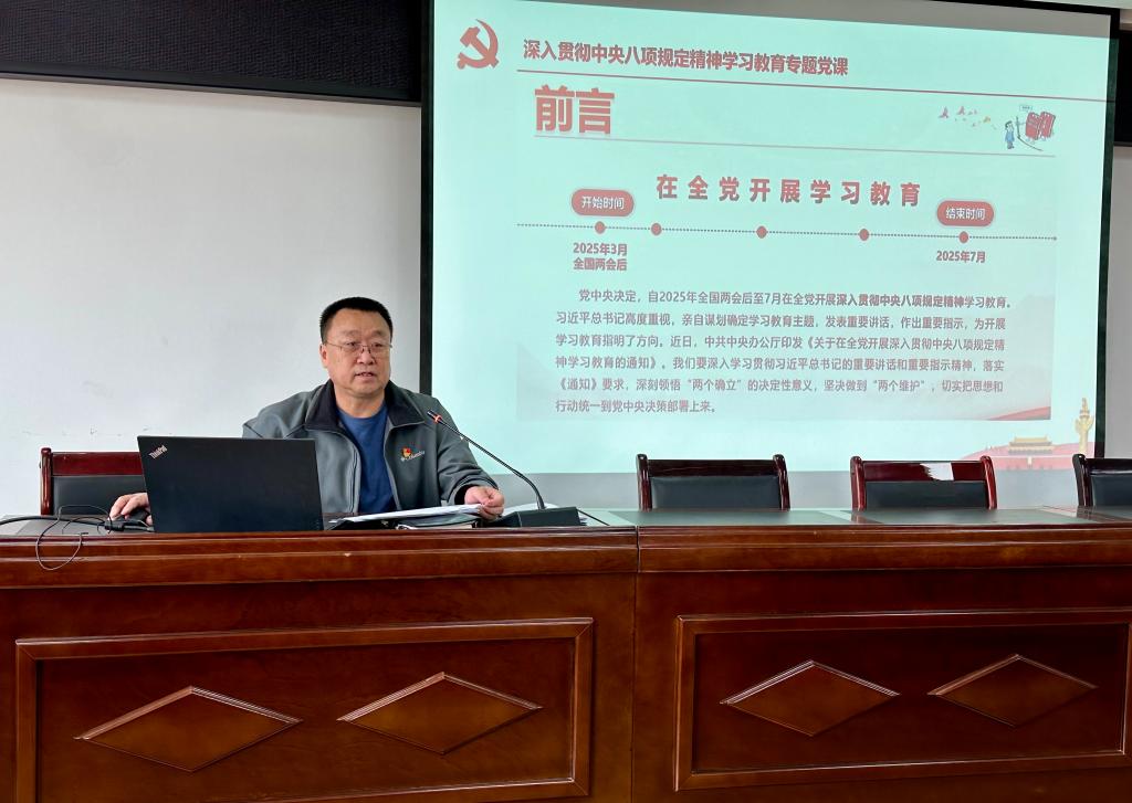 会上,郭凌峰作深入贯彻中央八项规定精神学习教育专题党课,全体党员集中观看教育片。