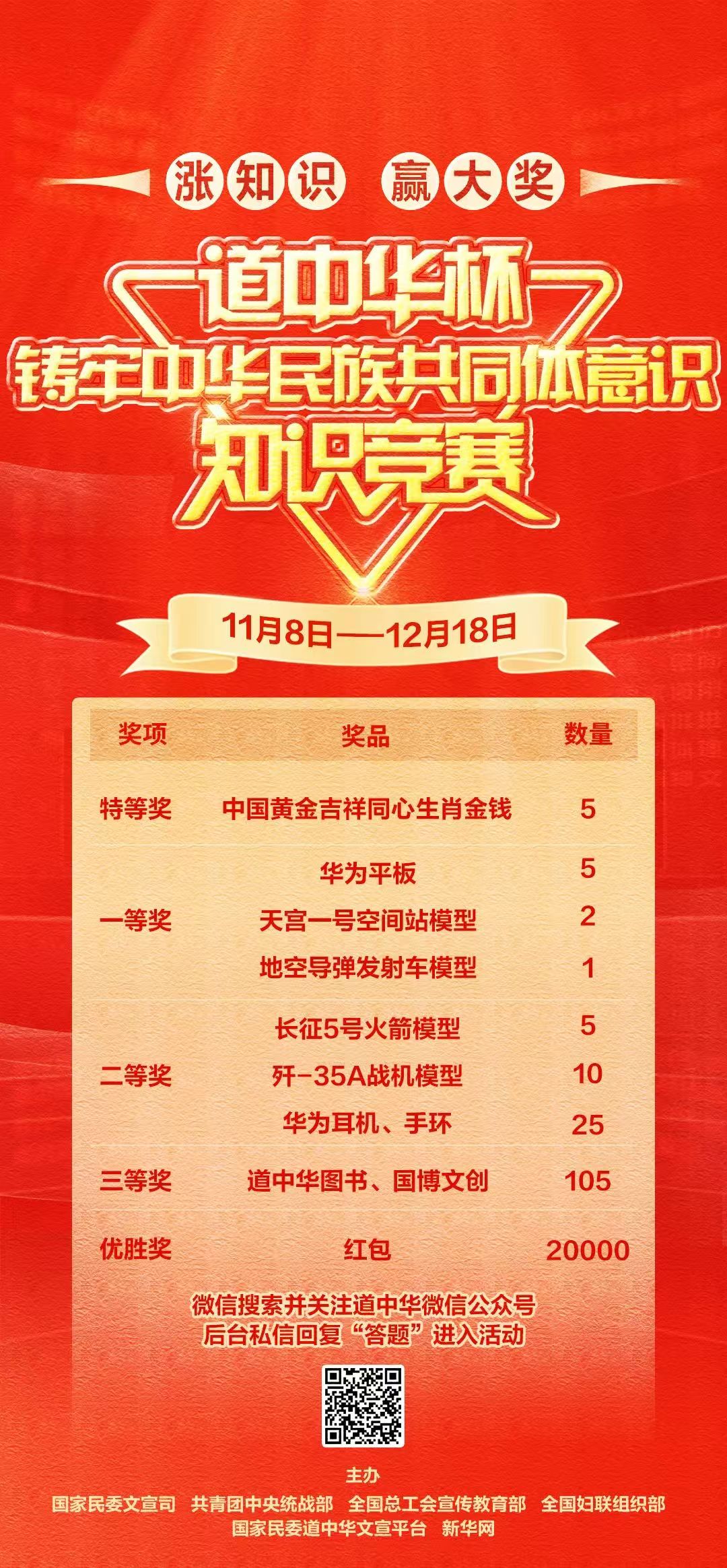 “道中华杯”铸牢中华民族共同体意识知识竞赛自11月8日启动以来,社会各界积极参与反响热烈。答题人数突破60万大关,答题次数超过175万人次。应广大粉丝要求,经主办单位协商,决定将本次知识竞赛延长至12月18日,欢迎广大网友继续参与答题和分享,一起铸牢中华民族共同体意识!
