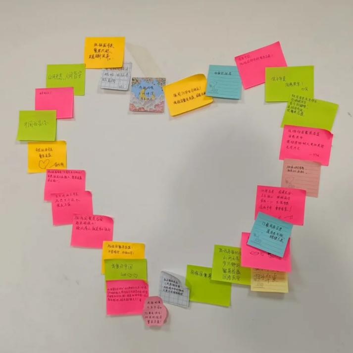 同学们在便利贴上写下对祖国的祝福,“我爱你中国”“祝福祖国繁荣昌盛”“生于华夏,倍感荣幸”“山河无恙,人间皆安”“清澈的爱,只为中国”。一句句祝福语表达了同学们对祖国的深切爱意,更是民族认同感和自豪感生动体现。