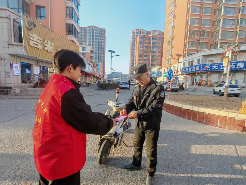 讲座结束后,志愿者们和社区工作人员一起进入小区向居民发放消防安全知识手册并普及消防安全知识。