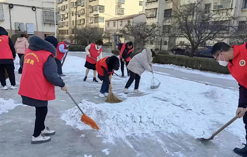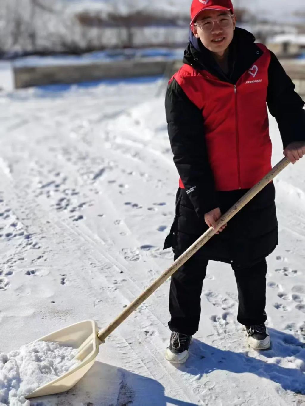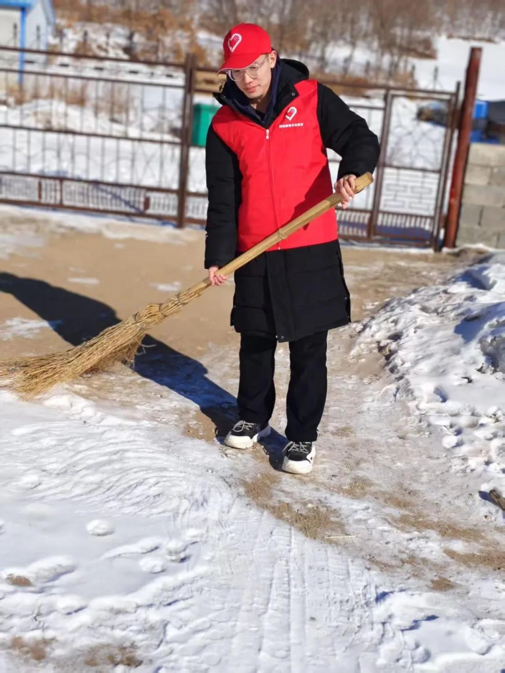 大家分工明确,有人负责铲除厚雪,有人清扫碎冰,还有人将铲起的雪堆到路边。在寒冷的冬日里,每个人的额头上却都冒出了汗珠,呼出的热气瞬间化作白霜。尽管双手被冻得通红,可没有一个人喊累。路过的村民纷纷投来赞许的目光,还有些热心村民也主动加入到我们的队伍中来。