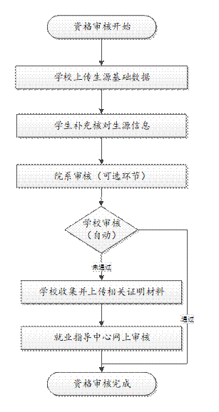 学校就业工作部门在内蒙古24365大学生就业服务平台(https://www.nmbys.cn)上传生源数据,毕业生登录平台进行生源信息补充核对,确认无误后依次经院系审核、学校审核,审核未通过的,将证明材料上传至平台,由自治区教育厅就业指导中心工作人员审核。